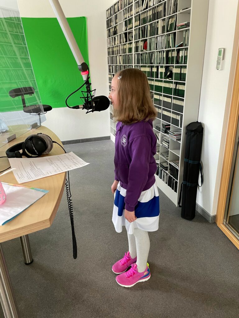Letzte Woche war ich im Radio. Ich erzähle euch wie es war und wie es dazu gekommen ist: Meine Mutter hatte mir erzählt, dass es jetzt so eine Aktion gibt bei der man ein Bild malt und es dann vielleicht als Plakat im Geropark aufgehangen wird und dass es vielleicht auch hilft, dass kein Müll mehr im Geropark liegt. Also habe ich mitgemacht. Auf mein Bild habe ich Müll auf die Wiese gemalt, weil da auch wirklich immer Müll liegt und das finde ich nicht gut. Am nächsten Tag habe ich das Bild meiner Lehrerin Frau Hardt gegeben und irgendwann hat Frau Hardt angerufen und gesagt, dass ich zu Radio 90,1 darf. Da war ich total überrascht. Frau Hardt schickte mir die Fragen die ich beantworten musste. Die Fragen habe ich geübt und am Donnerstag war es endlich so weit und ich ging zu Radio 90,1! Ich hatte Schmetterlinge im Bauch. Als ich drin war sah es anders aus als ich gedacht habe. Da standen Computer und Schreibtische in derselben Farbe. Da gab es ein Studio mit einem großen Mikrofon. In eines musste ich hineinsprechen. Diese Fragen musste ich beantworten: